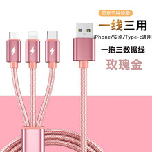 昊微 三合一数据线快充适用苹果安卓华为一拖三type-c充电器线p30荣耀20小米红米加长车载多功能 玫瑰金【一拖三快充线】 3米