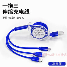 HKXA数据线三合一多功能充电器线伸缩一拖三车载适配华为安卓苹果快充三头 【高贵蓝】全铜芯3A快充1.5米