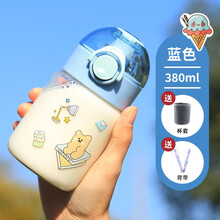 悠家良品吸管玻璃杯女可爱韩版便携玻璃水杯女士可爱型玻璃儿童水杯男女学生成人孕妇无铅带吸管杯子 蓝色380ml+杯套和背带