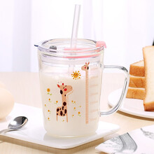 尚生物 儿童牛奶杯刻度冲奶杯吸管杯喝奶高硼硅玻璃水杯带盖子可微波炉加热 小鹿款+勺子+吸管+杯刷吸管刷