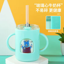 儿童杯子刻度牛奶杯防摔带把手吸管宝宝喝奶粉玻璃水杯耐高温可爱 300ML升级保护款小熊蓝