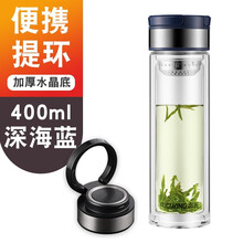 富光玻璃杯 双层商务大容量玻璃杯子 带提环便携男女玻璃水杯 车载透明茶杯 蓝色 400ml
