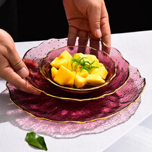 法兰晶 日系玻璃水果盘干果盘客厅茶几家用果盘玻璃盘子荷叶盘 紫色描金荷叶盘【【小号+中号+大号3件套】