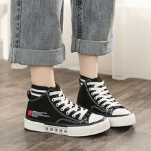韩国新款高帮加绒帆布鞋女鞋子2020年秋冬季棉鞋百搭厚底板鞋球鞋 黑白 35
