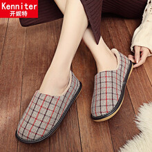 开妮特(Kenniter)秋冬季居家包跟保暖棉拖鞋男女士室内家用防滑厚底加绒布棉鞋老人 TYT001灰红格子/女 27(适合38/39码)