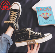 人本女鞋高帮帆布鞋女2021年春季新款韩版时尚休闲鞋学生厚底板鞋子 黑色 女38