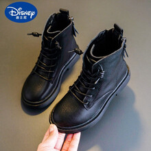 新上市(Disney)女童马丁靴皮质儿童短靴春秋单靴2021新款冬季英伦风走秀黑色童鞋 黑色 单靴 23