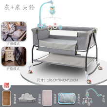 迪士尼婴儿床新生儿床拼接大床宝宝摇床bb儿童床摇篮床多功能移动可折叠 浅灰-加大加宽+床头铃