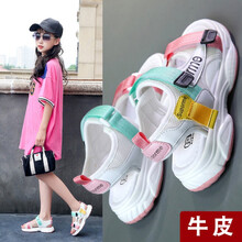 女童凉鞋真皮2021新款小公主夏季时尚中大童女孩沙滩鞋小学生儿童软底运动风凉鞋伊诺熊 白色 36码内长22.5CM