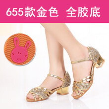 绚萌 童鞋夏季拉丁舞鞋儿童小女孩舞蹈鞋低跟水晶演出女童跳舞凉鞋少儿软底 2金色胶底 35码内长22cm