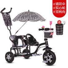 儿童双人三轮车双座二胎脚踏车双胞胎婴儿推车自行车小孩童车 银色 黑色+伞