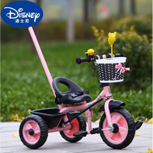 迪士尼新款2021儿童车可折叠车筐儿童三轮车带推杆女宝宝自行车学步车遛宝宝骑车 手推樱桃粉经典款W69