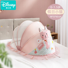 迪士尼(Disney)婴儿床折叠蚊帐免安装便携式通用全罩式可收挡光罩婴儿推车防蚊帐 假日小猫-小号【升级遮光细腻网纱】建议0-1.5岁