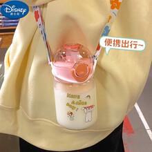 迪士尼(Disney)旗舰同款 宝宝水杯吸管杯儿童杯子家用喝水小巧便携幼儿园玻璃水壶可爱水瓶 粉色380ML+背带 送杯刷+吸管刷