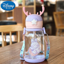 迪士尼(Disney)儿童水杯上学专用带吸管幼儿园夏季水壶外出背带水瓶宝宝喝水杯子 紫色600ml 送杯刷吸管刷