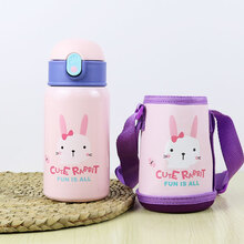 特百惠商场同款卡通宝宝水壶儿童保温杯带吸管小学生幼儿园便携背带不锈钢水杯子礼品礼物送人 粉盖 兔子 (杯套)400毫升