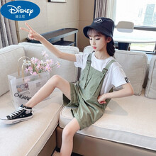 迪士尼 Disney 女童背带裤 女童背带裤套装夏季两件套2021新款短裤中大童时尚表演幼儿园六一 军绿色单件背带裤 170cm