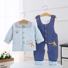 男女宝宝套装薄夹棉婴幼儿春秋装0-1-2-3岁纯棉衣服保暖背带连体裤两件套开裆外套开扣 蓝色围巾熊款 100码
