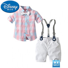 迪士·尼(Disney)同款男童夏装套装帅气儿童短袖背带裤纯棉绅士宝宝周岁英伦风礼服潮服小孩子夏天穿 粉蓝格子+白色短裤 80cm