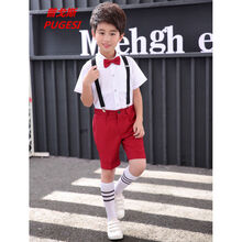 普戈斯六一儿童演出服男女童背带裤中小学生大合唱团幼儿园朗诵表演服装 男款 酒红色 短袖五件套 150cm
