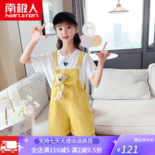 童装女童套装夏装儿童洋气牛仔背带短裤两件套小学生12岁女孩夏季衣服十岁中大童裤子 南极人官方旗䚀店-黄色【背带裤+T恤】 南极人官方旗䚀店-110...
