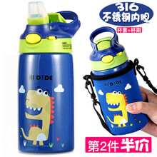 儿童保温杯316不锈钢带吸管儿童水杯宝宝男女学生户外旅行便携保温水壶背带杯套学饮杯耐摔防漏喝水杯子 深蓝小恐龙