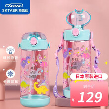 日本skater儿童水杯带吸管防摔直饮杯子便携幼儿园宝宝学生少女背带水杯 新款-蓝色恐龙480ML