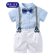 汉策儿童衣服夏季新款男宝宝短袖衬衫背带裤男童绅士周岁礼服二件套装 绅士蓝 90cm