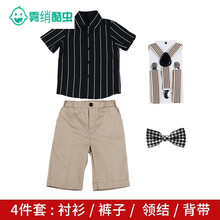 春夏新款10岁男孩小主持人礼服儿童套装新品男童条纹短袖背带裤套宝宝合唱主持礼服 男孩9岁黑条纹4件套小孩小西装 男孩9岁140cm:建议体重50-58斤小...