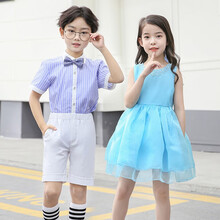 衣诺坊 儿童演出服装六一儿童节礼服幼儿园大合唱朗诵表演背带裤 蓝色男款(短袖衬衫+白色短裤+领结+袜子) 160cm