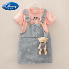 ℘Disney/迪士尼 女童短袖套装2021夏装新款儿童韩版洋气小熊牛仔背带裙两件套潮 粉色-小熊背带裙套装 150码建议身高140-150厘米