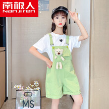 南极人5-12岁女孩夏天穿的时尚背带裤女童夏装牛仔短裤21儿童洋气中大童女孩甜美背带裤子12岁潮9小 绿色背带裤+白T恤 150/145cm