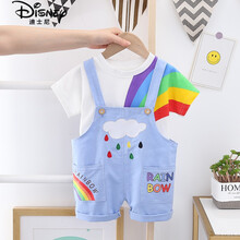 迪士尼童装旗舰新品宝宝夏装男女童背带裤套装2021新款童装短袖4岁婴儿童衣服两件套 CX彩虹背带蓝色 73cm