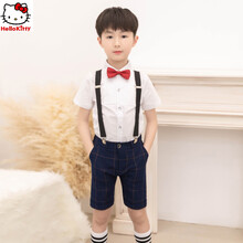 Hello Kitty凯蒂猫商场同款花童婚礼儿童小西装套装男孩英伦主持人钢琴演出服六一合唱礼服夏 男童背带款(蓝格短裤+Z衬衫+背带+领结) 140cm