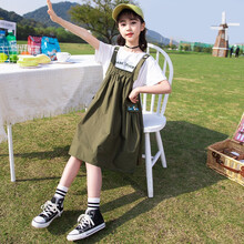 女童夏装洋气背带裙套装2021新款大童儿童夏季女孩连衣裙子两件套 军绿色 150cm