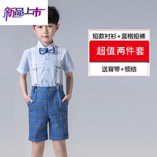 迪士尼旗舰男童礼服儿童小西装套装中大童主持人钢琴演出服夏季男孩英伦西服 浅蓝上衣+短裤+背带+领结 140cm