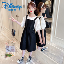 迪士尼(DISNEY)女童背带裙女童连衣裙夏季2021新款洋气网红儿童背带裙中大童女孩短袖套装裙小孩 黑色 AS背带裙两件套装 150码