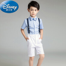 迪士尼 儿童礼服小花童主持人男童钢琴演出服装背带裤合唱表演套装夏学生童装 细蓝+白四件套C【细蓝条纹短袖+白色短裤+背带+领 130cm