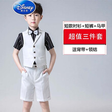 迪士尼3-14岁孩子穿的礼服儿童小西装套装中大童主持人钢琴演出服夏季男孩英伦西服 白马甲+短裤+衬衫+领结+背带 150cm