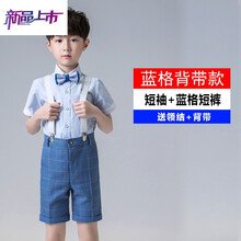 迪士尼旗舰男童礼服夏儿童小西装套装英伦帅气正装男孩主持人钢琴走秀演出服 蓝格背带款 送领结+背带 130cm