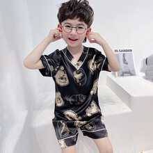 宠儿依人 男童夏季冰丝睡衣男孩薄款短袖空调服套装儿童宝宝小童卡通家居服 【双短V领】黑色NW熊 140码 高130-140 50-60斤