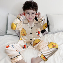 宠儿依人男童睡衣冰丝薄款春秋季小童宝宝男孩可爱夏季短袖长裤儿童家居服 【丝滑长袖】红嘴鸭 150码 高140-150 60-70斤