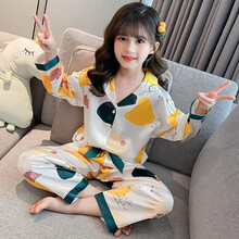 童装儿童睡衣女 4-15岁女童春秋夏季冰丝睡衣长袖短袖薄款中大童小女孩空调服宝宝夏天开衫家居服套装 T2044(蝴蝶结长袖小猪) 160码建议身高155cm左右