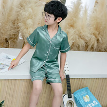 儿童睡衣薄款夏季男童家居服中大童宝宝男孩冰丝短袖夏天套装12岁 绿条纹 150码建议身高140-150厘米左右