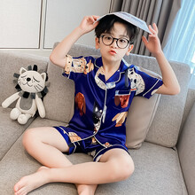 欧菲兔品牌童装男儿童睡衣2021韩版新款夏季家居服两件套宝宝冰丝短袖套装中大童空调服小孩衣服 深蓝色 170cm