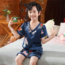 ゐ新品牌特价童装适合1-14岁6小孩穿的儿童夏季冰丝睡衣男童宝宝套装女童男孩春秋长袖薄空调家居服闪电 V领藏青色小鹿短袖 160码【建议145-150cm】