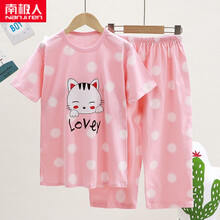 南极人 夏季儿童短袖套装纯棉男童女童空调服中大童家居服薄款小孩睡衣夏小孩穿 粉色猫咪 七分裤 130