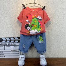 迪士尼小孩子穿的男童帅气潮装童装2021新款网红儿童短袖t恤短裤夏季宝宝时髦衣服 红色 120cm(建议身高112cm左右)