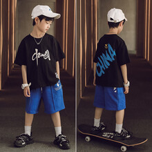 短袖T恤男童夏装国潮2021新款中大童纯棉短袖T恤短裤男宝宝套装夏季潮帅官方舰店 黑色 X21369中套装 120cm