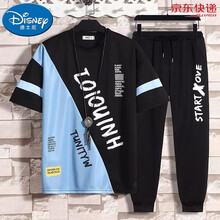 迪士尼童装特卖 男童短袖套装夏装胖男孩13学生大童T恤两件套帅气12-15岁男装衣服3-14孩子穿的 蓝色拼接套装长裤 L(95-105斤)